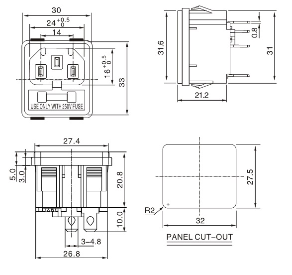 當前位置:首頁 > 產品展示 > AC電源插座 > 品字帶單保險-C14